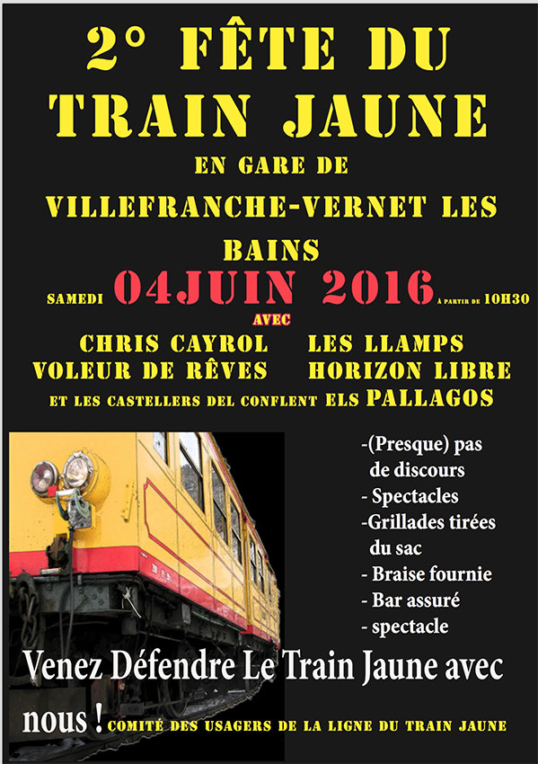 En attendant, il invite toutes celles et ceux qui sont attachés à ce train d’exception à venir le fêter ensemble samedi 04 juin à partir de 10h30 en gare de Villefranche Vernet les Bains Fuilla pendant la 2° fête du Train Jaune.