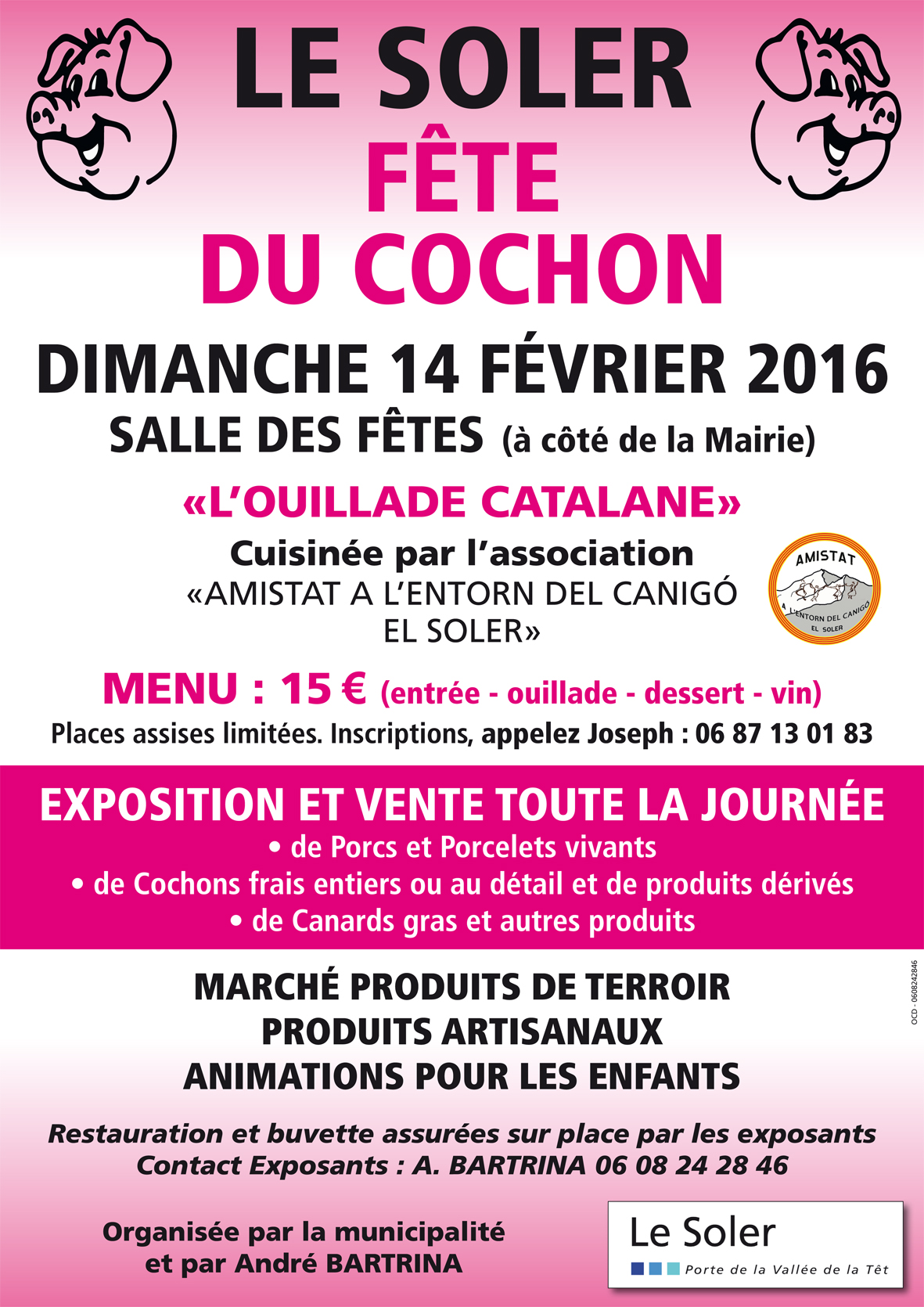 La 5ème Fête du Cochon du Soler organisée par la Municipalité et André Bartrina aura lieu le dimanche 14 février 2016, à la Salle des Fêtes. Tout au long de la journée, de 9h à 18h de nombreux artisans charcutiers et exposants vous attendent pour une agréable promenade gourmande pleine de surprises gastronomiques.