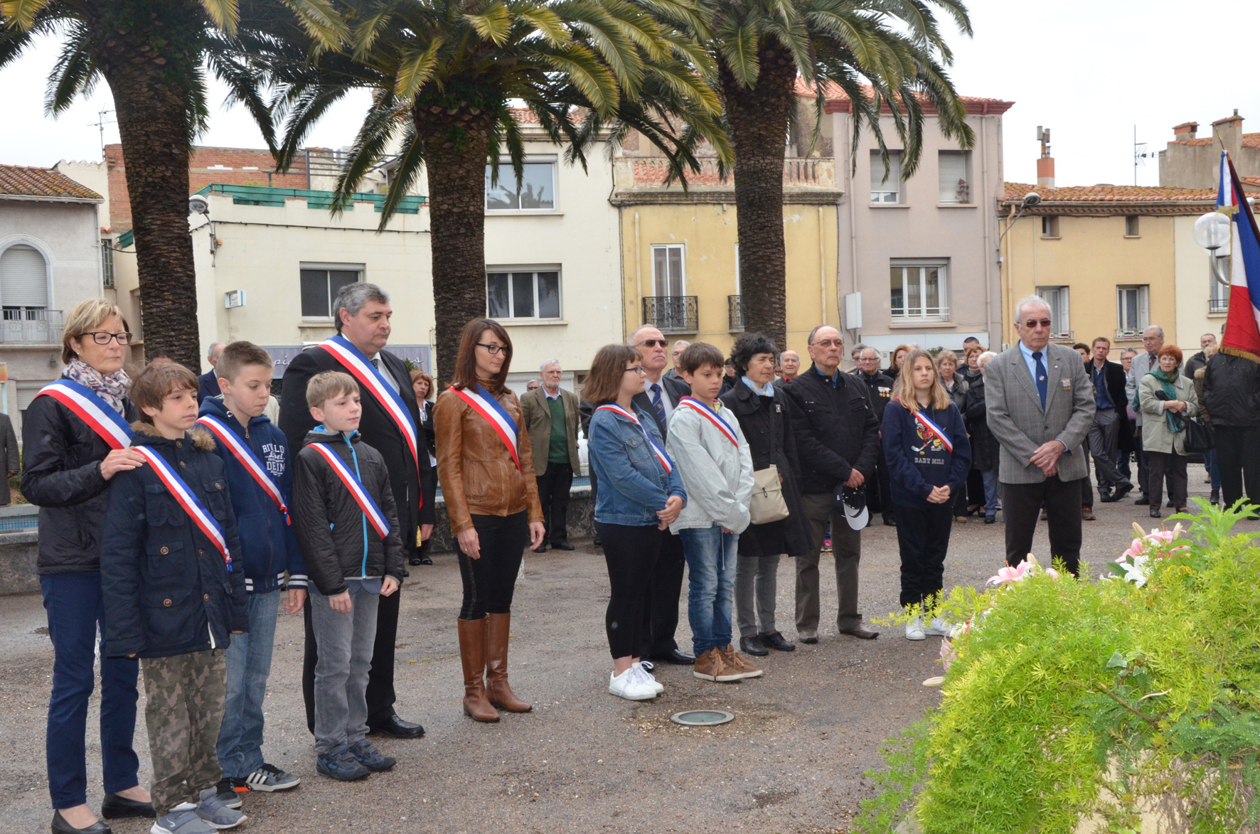 Le cortège est parti du parvis de la mairie, accompagné par la fanfare Jovent del Monestir  afin que le Conseil Municipal, le Maire, les anciens combattants, l’association du Souvenir Français, les représentants de la police et de la gendarmerie de la ville, les élus du Conseil Municipal des Enfants et des Jeunes puissent déposer les traditionnelles gerbes au monument aux morts.