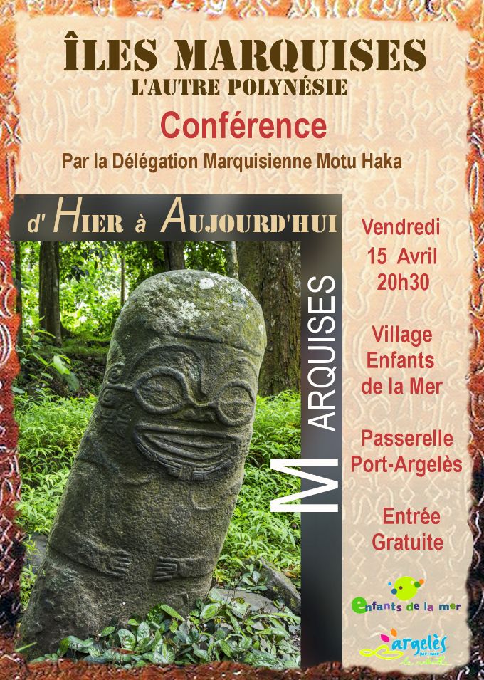 – 20 h 30 : conférence sur le thème Les Îles Marquises d’hier à aujourd’hui, présentée par la délégation Marquisienne. Entrée gratuite ; village Enfants de la Mer (promenade du Front de mer – côté port).