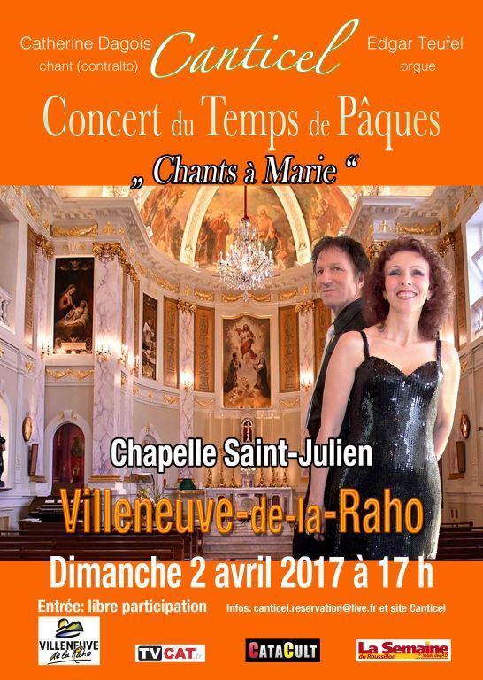 Dimanche 2 avril à 17h la superbe et chaleureuse Chapelle Romane Saint Julien de Villeneuve de la Raho à l’acoustique parfaite et aménagée comme une très confortable salle de concert, servira d’écrin au nouveau concert spectacle de Canticel avec mise en espace en lumière. Laissez-vous envoûter par les charmes de ces « Chants à Marie ». La voix très rare, sombre et profonde de contralto de Catherine Dagois et le virtuose Edgar Teufel et son extraordinaire orgue orchestre, nous content l’histoire de la Passion du Christ jusqu’à la Résurrection, à travers des œuvres créés par les plus grands compositeurs, en hommage à la Vierge, extraites de la Résurrection, du Messie de Haendel, des Stabat Mater de Dvorak et Pergolèse.
