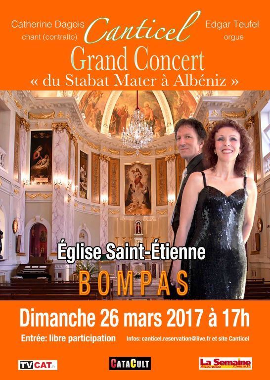 Dimanche 26 mars à 17 heures, la somptueuse Église Saint-Étienne de Bompas, servira d’écrin à une prestigieux soirée, de la grande « Ballade » 2017 de concerts- découvertes du duo Canticel, dans les lieux parmi les plus beaux et les plus émouvants de notre Pays Catalan. Suivant la tradition des grandes représentations sacrées telle la Résurrection de Haendel, Venez partager avec eux beaucoup plus qu’un simple concert, une soirée vivante et festive avec mise en lumière et en espace. Laissez-vous envoûter par des œuvres de musique sacrée puisant leur inspiration dans l’art populaire : l’intégrale du plus beau Stabat Mater jamais composé celui de Vivaldi entouré d’ œuvres célèbres comme la Farandole de Bizet ou l’Ouverture des Chants d’Espagne d’Albeniz.