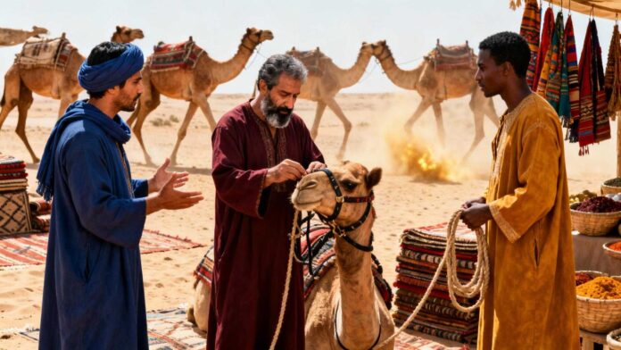 La poussière dorée se soulève sous les sabots des dromadaires. Les négociations se déroulent en hassanya, langue des nomades. Les éleveurs berbères et les marchands sédentaires partagent le thé sous des tentes improvisées.