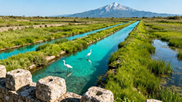 À six heures trente ce matin de janvier, un agriculteur tourne la roue d’une vanne en fonte au bord du canal d’Ortaffa. En vingt minutes, trois hérons cendrés et deux aigrettes garzettes se posent sur la parcelle fraîchement inondée, comme si quelqu’un venait de déplacer la géographie de l’eau sous leurs ailes. Nous sommes à quinze kilomètres au sud de Perpignan, dans un morceau de Roussillon que vous traversez sans le voir depuis l’autoroute, là où la plaine du Tech dessine le dernier delta agricole d’eau douce des Pyrénées-Orientales.