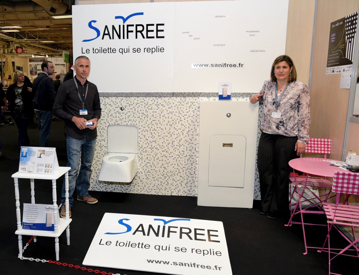 Depuis 2011, Rachel et Philippe travaillent sur le « SANIFREE », un pack WC-toilette autonettoyant totalement rabattable et encastré. SANIFREE « la toilette qui se replie », comme le slogan l’indique, permet ainsi de faire disparaitre les WC, dans les murs ou dans un meuble prévu à cet effet offrant ainsi un gain d’espace significatif.