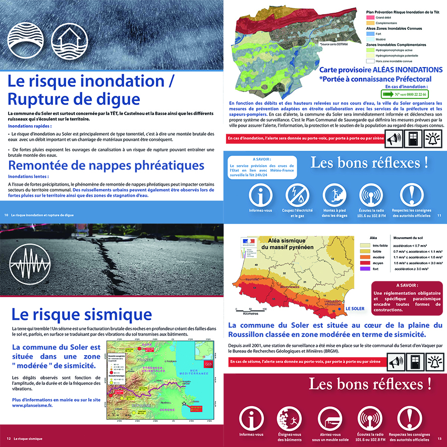 Ce guide met en évidence l’ensemble des risques naturels et technologiques identifiés à ce jour sur le territoire du Soler. Il vous permettra d’être informé et de vous familiariser sur les consignes à tenir pour garantir votre sécurité, mais aussi d’appréhender les procédures et les moyens qui seront déployés par la municipalité et les services de l’Etat lors de ces événements naturels exceptionnels.