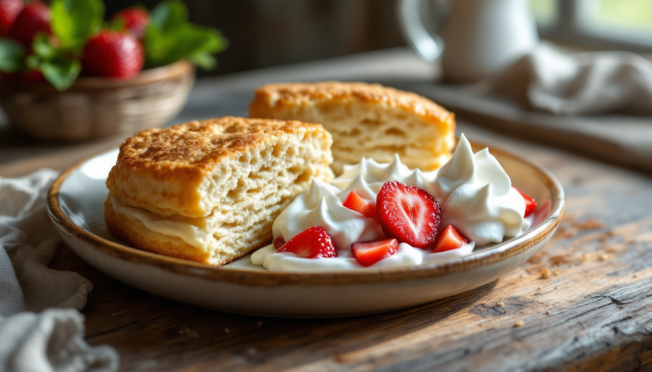 Serve this dessert immediately after assembly to preserve the contrast between warm biscuit, cool cream, and juicy berries. For a stunning presentation, place the bottom half of the shortcake on the plate, add a generous layer of whipped cream, spoon macerated berries with their juice over the cream, add another dollop of cream, and cap with the top half of the shortcake. Finish with a fresh strawberry slice and mint sprig.