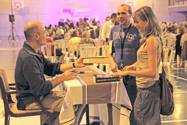 Cette soirée exceptionnelle a débuté par une séance de dédicace avec l’écrivain qui vient de publier le dernier tome de la saga « Troisième Humanité », le roman « La voix de la Terre » édité chez Albin-Michel. Dès 20h, une file d’attente impressionnante de plusieurs dizaines de mètres s’est formée devant le stand de la librairie CAJELICE et n’a pas désemplie jusqu’à 21h15.