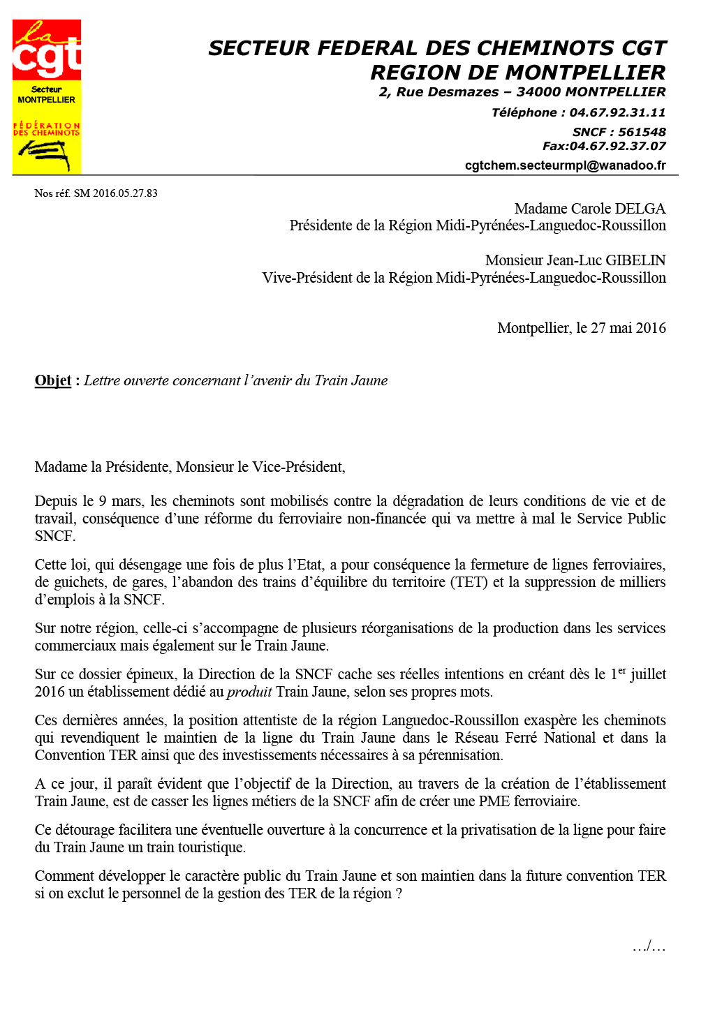 AccueilPyrénées-OrientalesLettre ouverte portant sur l'avenir du Train Jaune Lettre ouverte portant sur l’avenir du Train Jaune Par: Thomas Cibardi Date: 30 mai 2016 Vous trouverez ci-joint une lettre ouverte du secteur fédéral des cheminots de la région de Montpellier portant sur l’avenir du Train Jaune. En PDF ici : 2016.05.27 SM TRAIN JAUNE