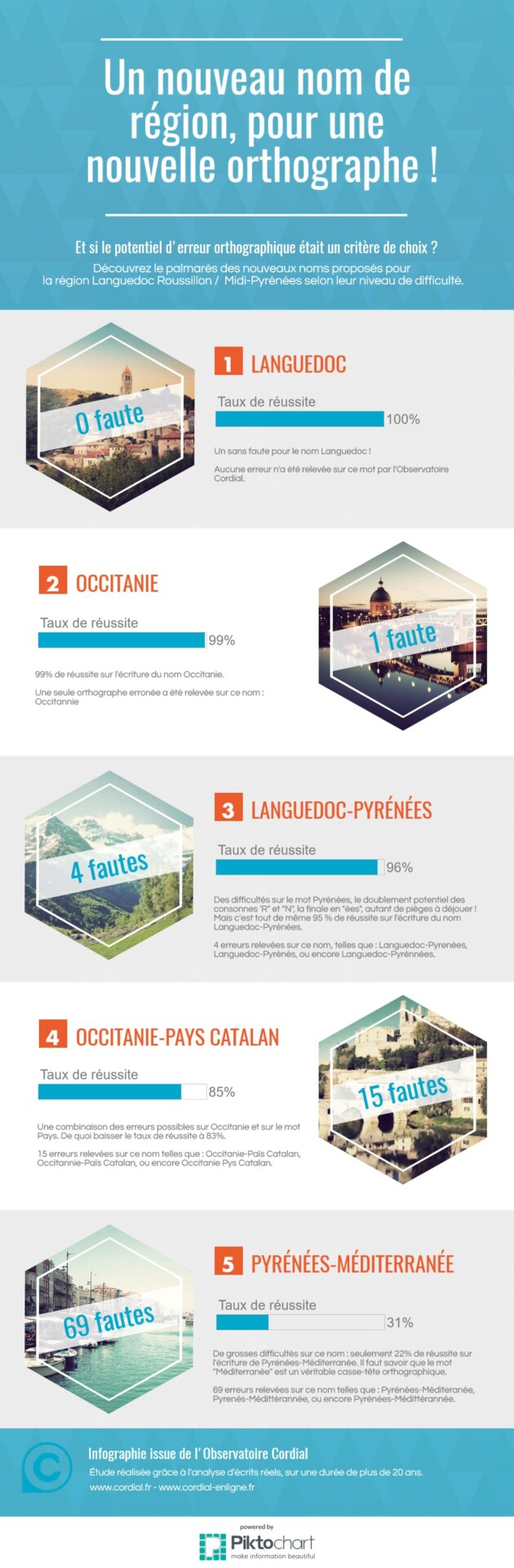 Toulouse, Juin 2016 – Il s’avère difficile de choisir le nouveau nom pour la région Languedoc Roussillon – Midi Pyrénées en tenant compte des préférences de chacun. Fort de l’observation de plus de 20 ans d’écrits, Cordial, le correcteur orthographique, vient proposer un argument supplémentaire en offrant son palmarès selon un critère rationnel : la simplicité d’écriture.