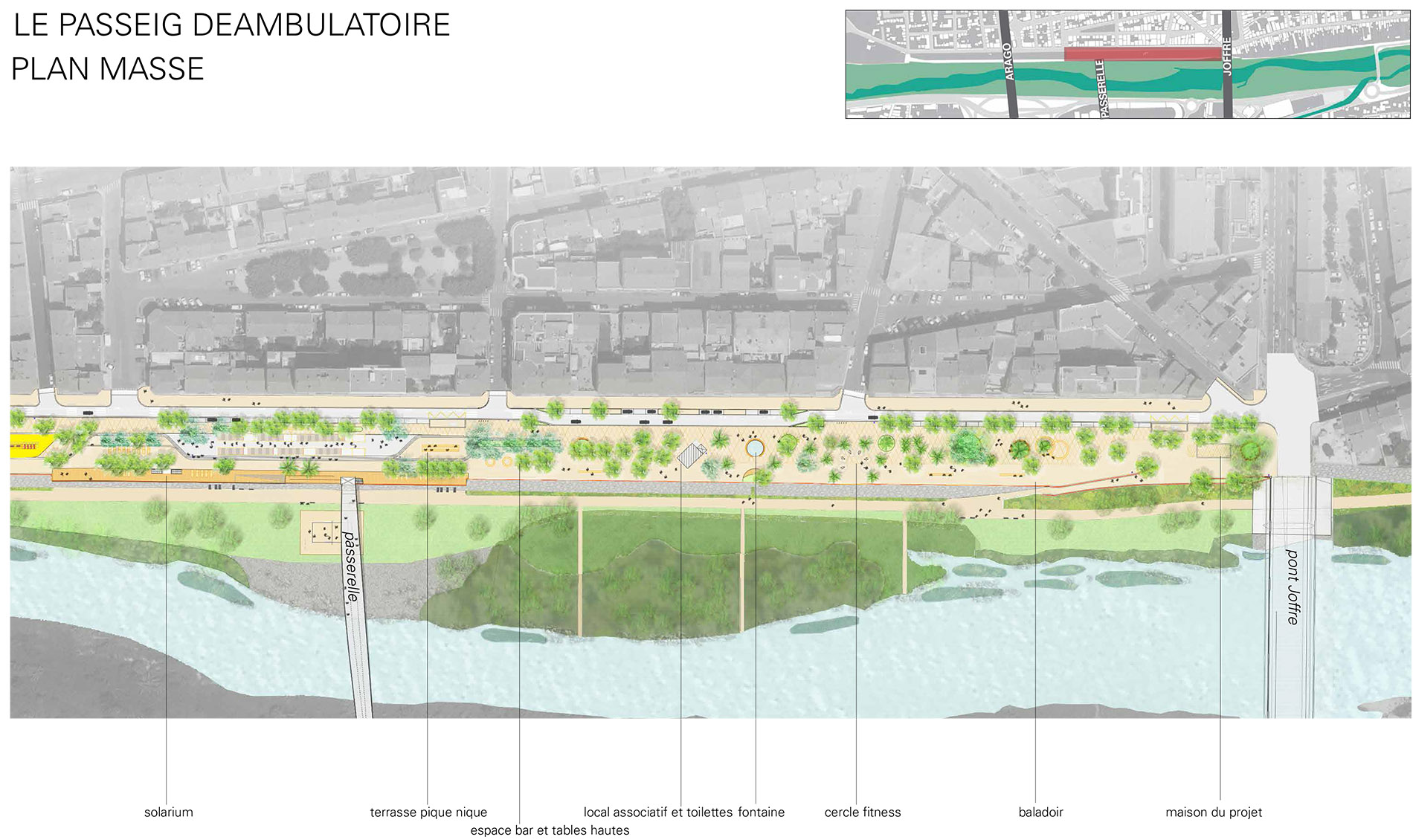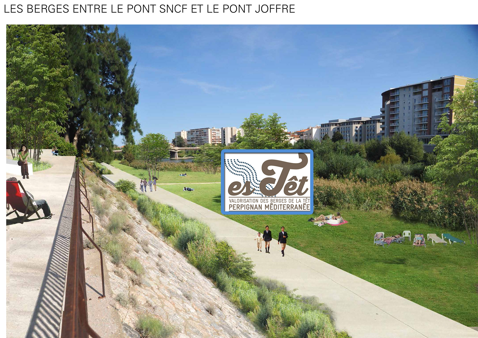 Ce « Passeig déambulatoire », authentique balcon au Sud de la ville, permettra d’apprécier les berges de la Têt et, à toutes générations confondues – familles, enfants, adolescents… – d’utiliser les aires de jeux. Ce « Passeig », qui s’étend entre les ponts Joffre et Arago, offrira 20 000 m² d’espaces publics, récréatifs et de loisirs.