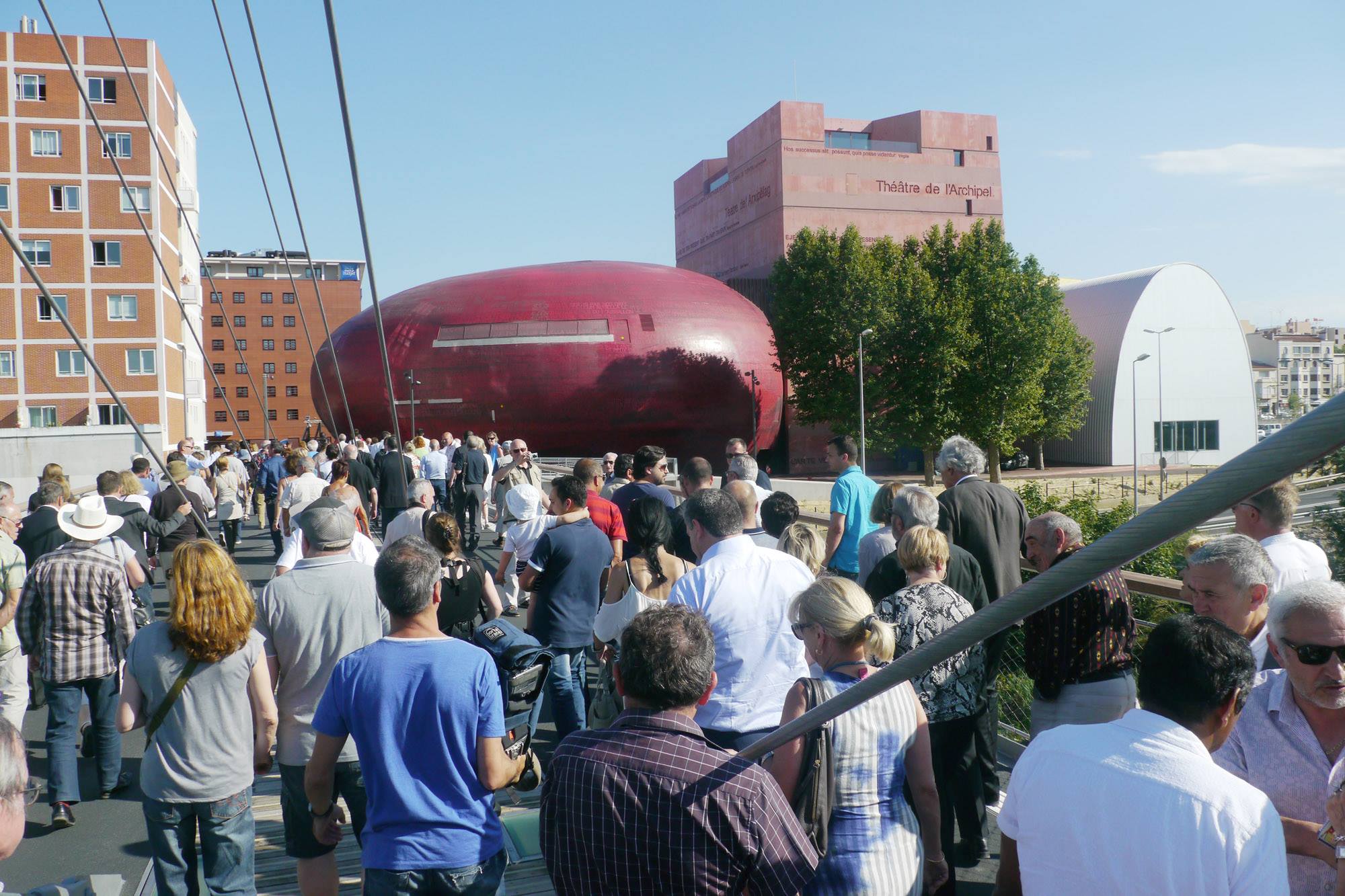 Lors de son discours, Jean-Marc Pujol (LR), maire de Perpignan, président de l’Agglo, n’a pas manqué de rendre un hommage indirect à son prédécesseur, Jean-Paul Alduy (UDI), ancien sénateur-maire de Perpignan, ex président de Perpignan Méditerranée Communauté d’Agglomération : « Beaucoup de gens l’ont critiqué, parce que beaucoup de gens n’y croyaient pas, aujourd’hui le monument existe ! L’enjeu ét nt, car il s’agit de rapprocher les Perpignanais. Bâtir une passerelle, ce n’est pas simplement jeter un pont entre deux rives, cela peut aussi être une façon théâtrale – faisant ici allusion très vraissemblablement à la proximité avec le Théâtre de l’Archipel ? – d’enjamber la ville, de connecter les populations entre elles qui vivent dans un même espace, sur un même territoire (…). Je suis convaincu maintenant, plus que jamais, que cette passerelle renforcera l’attractivité de Perpignan en général, de son centre-ville en particulier ».