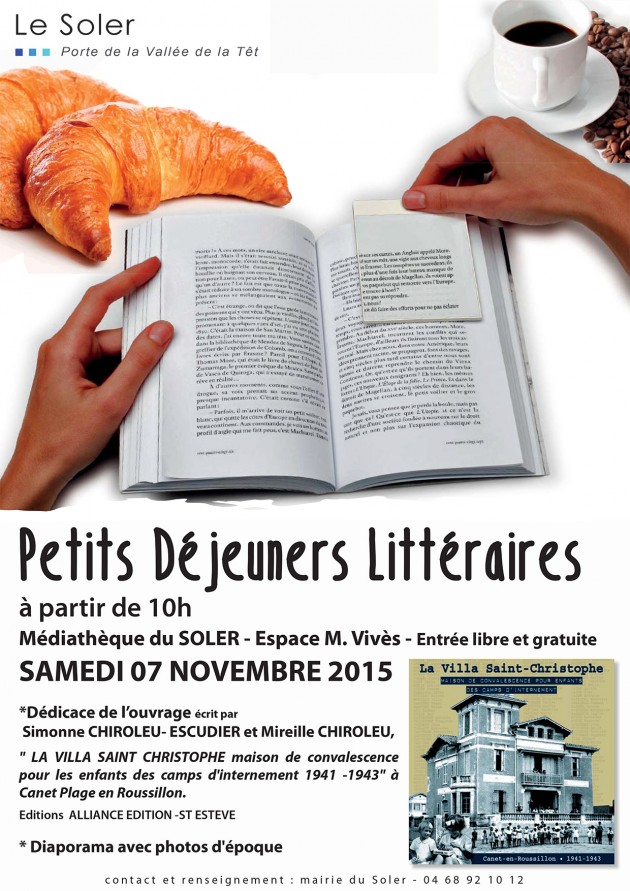 La ville du Soler est très heureuse de vous convier au prochain PETIT DEJEUNER LITTERAIRE qui aura lieu : le SAMEDI 7 NOVEMBRE 2015 à la Médiathèque du Soler, à partir de 10h à la Médiathèque du Soler, Espace M. Vivès- Entrée libre et gratuite
