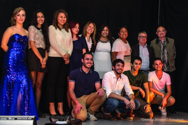 Photo Véronika Miojevic : Jurés, candidats et artistes réunis autour de Thomas Frentz et Indiana Carsin, vainqueurs du titre de la Voix d’’Or 2015 (Indiana Carsin, 2ème debout à partir de la gauche et Thomas Frentz, 1er à partir de la gauche agenouillé au premier rang, avec à ses côtes Mathieu Lopez et vainqueur du titre de la Voix d’’Or 2014)