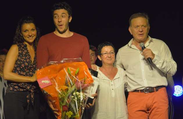 Outre le magnifique bouquet offert par la commune il a été récompensé par les partenaires du Festival avec des places pour les Déferlantes offertes par « Le Crédit Mutuel » qui donne le LA au Festival, une invitation, pour un repas gourmet, 2 personnes, au « Domaine de Rombeau » ainsi qu’un Bubbles offert par « Nayandeï » .