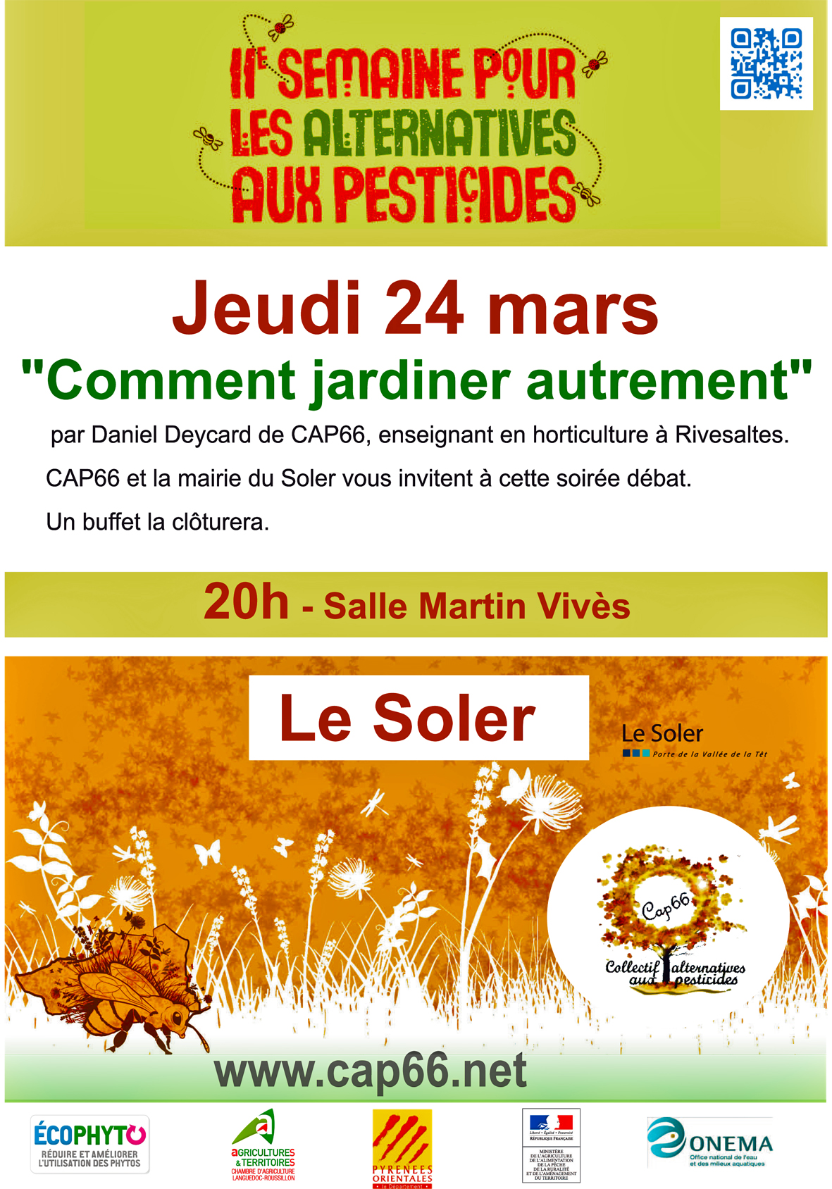 Cette soirée s’intègre dans le cadre de la 11ème Semaine Nationale pour les Alternatives aux Pesticides, pendant laquelle différentes actions coordonnées par l’association Cap 66 ont lieu dans les villes et villages du département du 13 mars au 9 avril 2016. Retrouvez le programme des animations à l’adresse suivante : www.cap66.net