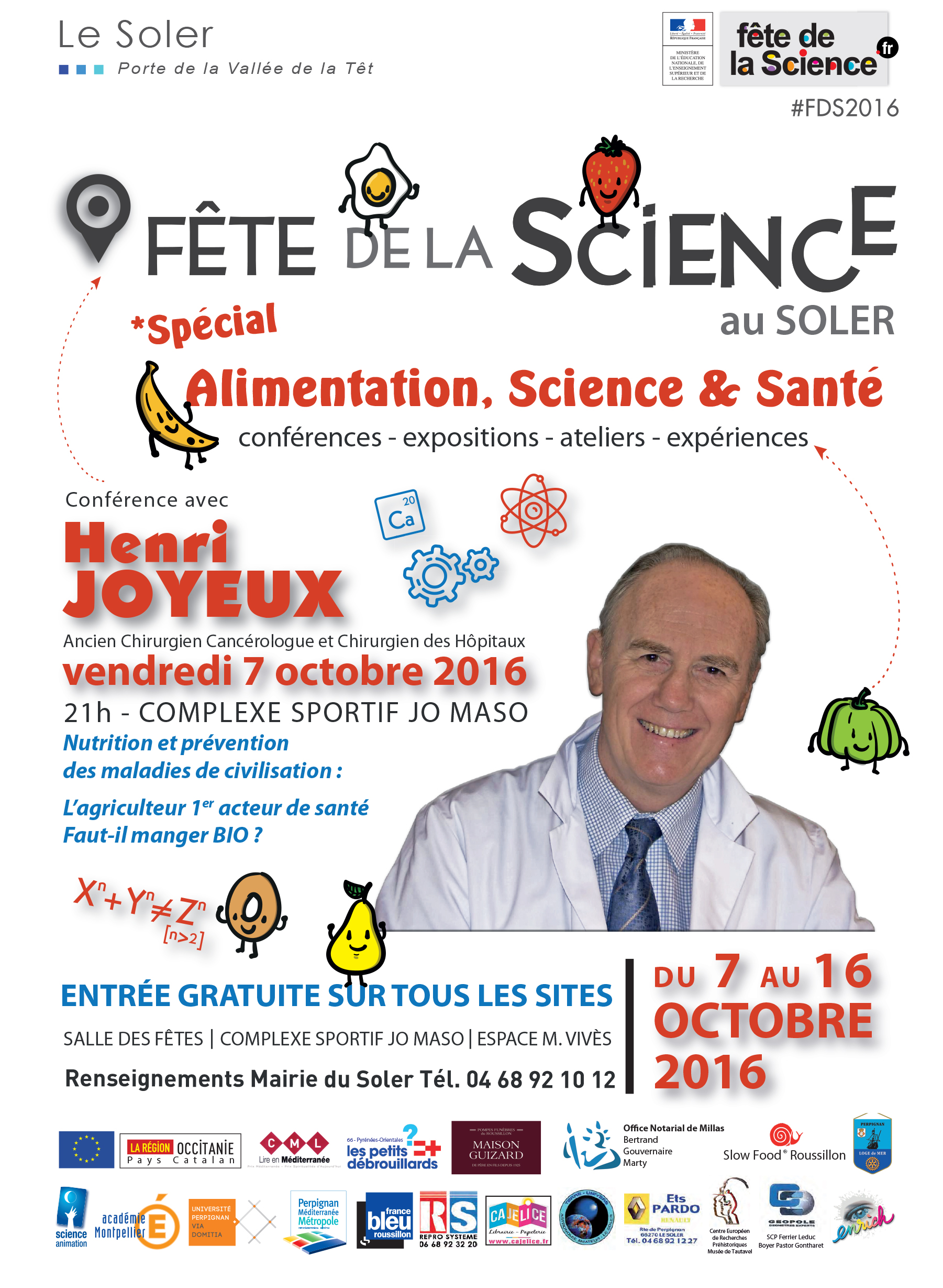 Le Professeur Henri Joyeux sera l’invité d’honneur de la soirée inaugurale de la Fête de la Science 2016 au Soler. A cette occasion il donnera une conférence sur le thème de la santé, la nutrition et l’agriculture BIO, le vendredi 7 octobre 2016 à 21 heures dans la salle du gymnase du complexe sportif Jo Maso du Soler.