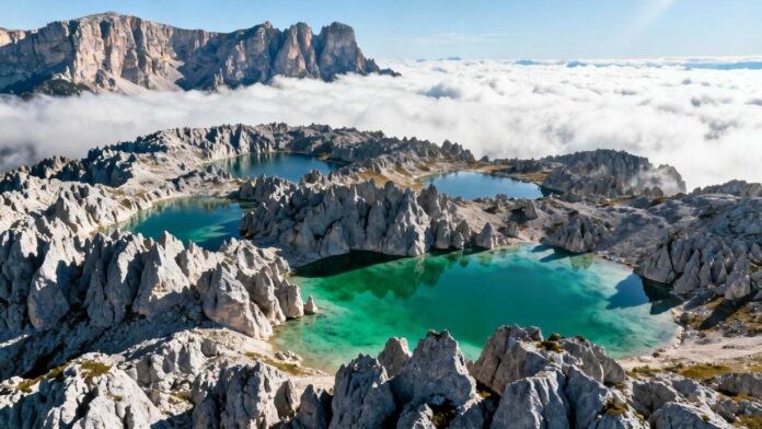 Paradoxe géographique saisissant : au cœur de ce désert alpin aride persistent plusieurs lacs glaciaires würmiens à 1950 mètres d’altitude. Leurs eaux translucides émeraude contrastent violemment avec les pelouses rases et les lapiaz blanchis. En hiver, ces miroirs liquides se parent de glaces partielles sculptées par les vents méditerranéens, créant des formations cristallines éphémères. Comme à Évol, les formations karstiques catalanes réservent des phénomènes atmosphériques d’une rare intensité.