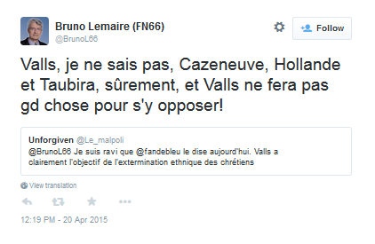 Bruno Lemaire (à ne pas confondre avec Bruno Le Maire de l’UMP), proche de Louis Aliot et conseiller municipal FN de Perpignan, un des conseillers économiques de la présidente du parti et secrétaire général du « think tank » du Front national (le Club Idées Nation), a écrit ce lundi 20 avril 2015 sur Twitter, en réponse à un tweet affirmant que « Valls a clairement l’objectif de l’extermination ethnique des chrétiens ».