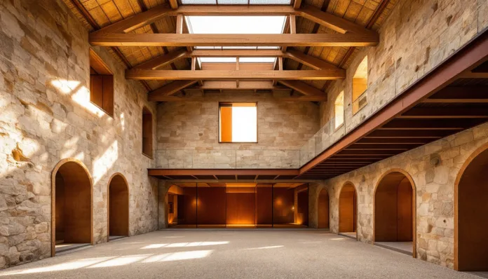 Les Caves Écoiffier, baptisées « Déclic Sud-Roussillon », représentent un exploit technique remarquable sur 453 m². L’architecte barcelonais Octavio Mestre, associé au cabinet nîmois C+D, a magistralement préservé les murs en cayrou traditionnel tout en créant des ouvertures révolutionnaires. Les caissons en acier Corten percent désormais la façade arrière, tandis que des lanterneaux avec contrôle solaire illuminent naturellement l’espace central autrefois plongé dans l’obscurité.